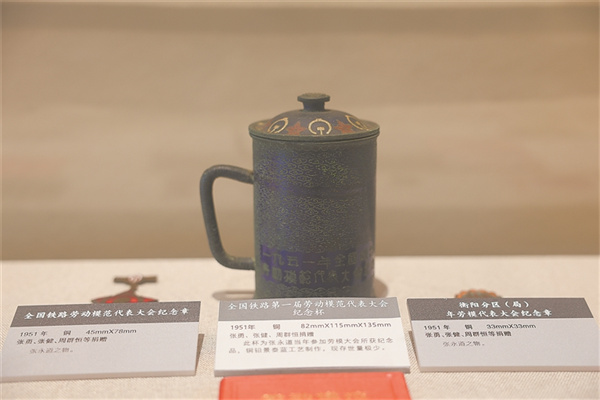 在广州铁路博物馆一号馆,陈列着一个制作工艺精湛的景泰蓝纪念杯,杯盖上印有路徽和红色五星图案,杯身布满祥云纹,并刻有铭文——“一九五一年全国铁路第一次劳动模范代表大会纪念杯”。它的主人是原衡阳铁路管理局瓦园站站务员张永道。