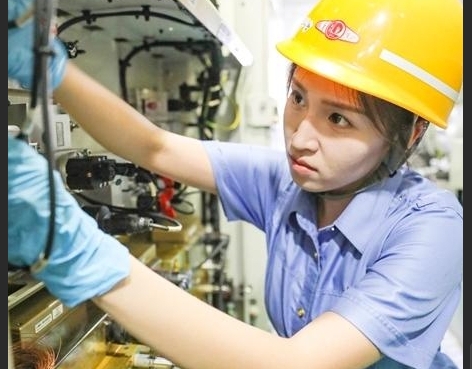 李韵菡对机车机械间内继电器螺丝进行防缓线检查。许伟/摄