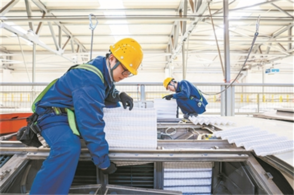 技术人员在对列车空调系统进行清洗维护。 新华社记者 杨青摄