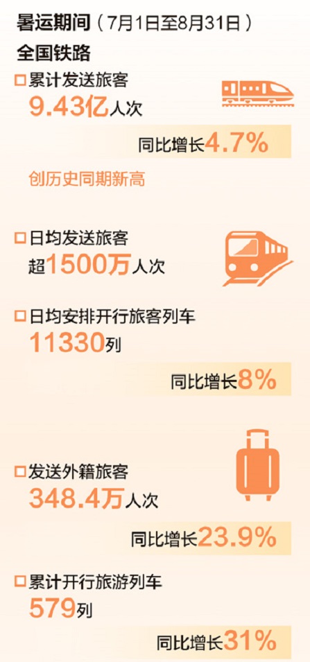 8月31日,为期62天的铁路暑运圆满结束。国铁集团数据显示,7月1日至8月31日,全国铁路累计发送旅客9.43亿人次,同比增长4.7%,创历史同期新高。