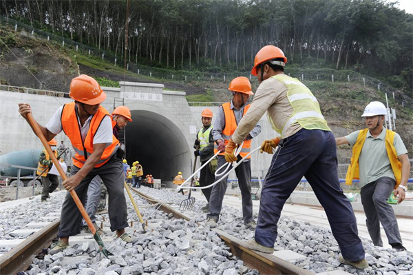 10月12日上午,在中老铁路曼木树隧道出口,中国中铁一局施工人员操作我国自主研制的新型长轨牵引车,将最后一组500米长钢轨精准推送到位,标志着中(国)老(挝)昆(明)万(象)铁路全线铺轨完成,实现国内与国外连通,向着年底开通运营目标迈出了重要一步。