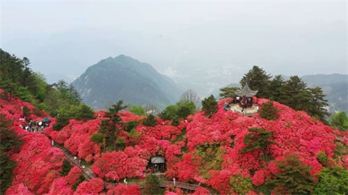 五一假期,湖北麻城龟峰山杜鹃花迎来最佳观赏期,中国铁路武汉局集团有限公司(下称武铁)在汉口、麻城北站间每天往返开行D9300、D9299次两趟动车组列车方便旅客赏花。