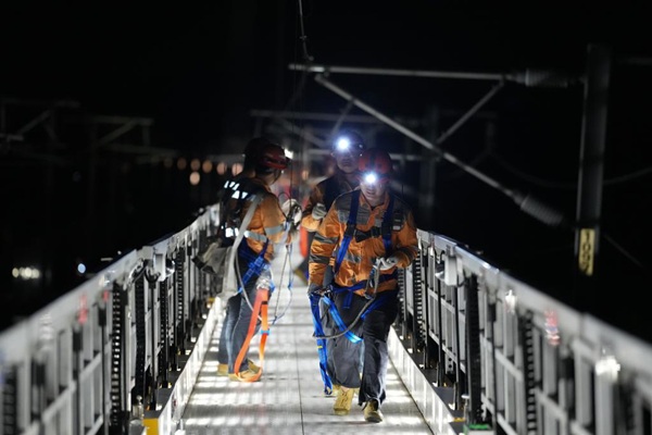 确认车顶平台升起后,记者随检修人员一同登上平台。一体贯通的170多米平台让检修人员“如履平地”,10组人员可以同时开展作业。“以前检修接触网要依靠人力推动的车梯,新型检修列车等新装备大大提升了检修效率。”陶旸说。