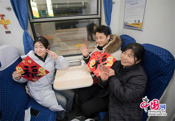 车厢内乘客向记者展示福字。中国网记者 马旷/摄