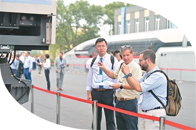 7月9日,第十二届世界高铁大会“高铁创新之旅”活动现场,参会代表在室外实车展示区进行观摩。王 玮摄(人民图片)