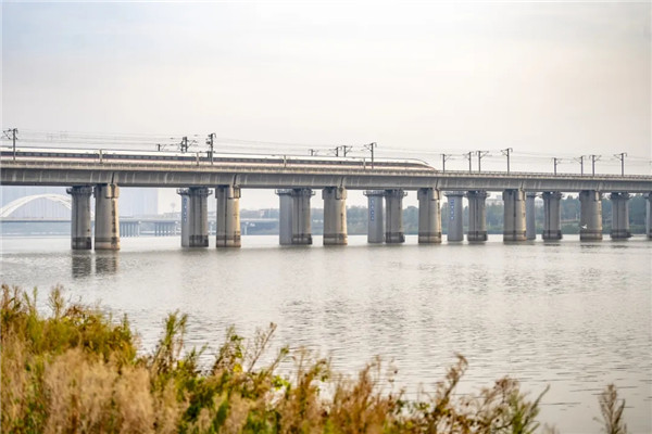 8月28日,G9845次动车组行驶在京港高铁昌九段抚河特大桥上。当日,该列车从南昌东站驶出,标志着昌九高铁南昌东至何家线路所段(昌九高铁先行...