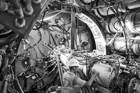 8月25日,工作人员在检查“永庆号”大直径盾构机设备线路。日前,广(广州站)南(广州南站)联络线建设取得新进展,“永庆号”盾构机稳步下穿陈村水道,跨动走线...