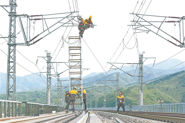 连日来,为保障暑期运输供电安全,北京供电段组织作业人员对管内供电设备进行隐患排查整治。图为近日,该段职工在管内唐包线上进行接触网设备检修作业。赵世杰 摄